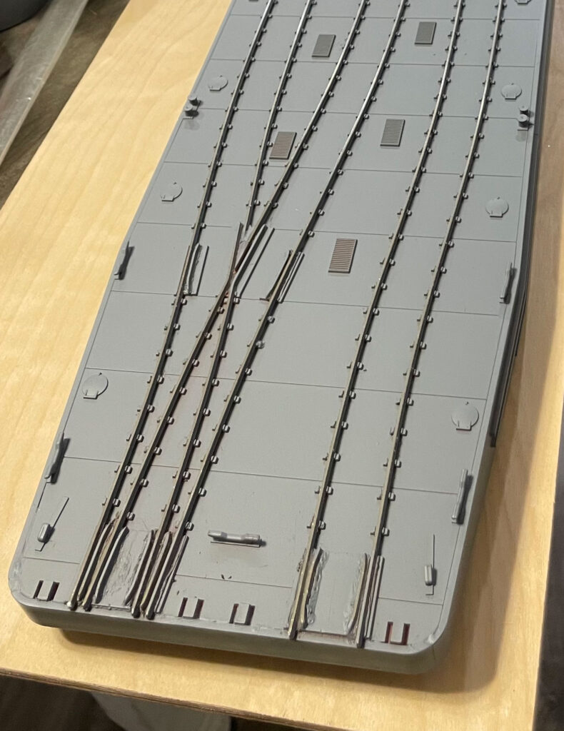 Many car floats have three tracks. The center track is accessed like a turnout that is on the car float but the points are on the transfer bridge. With the limited space to get a person’s hand in using a manual ground throw, and not wanting to make it permanent using an under the track Tortoise, I decided to use a double track gauntlet instead. This will make the track on the transfer bridge double tracked and the points are on the main base (land) just before the transfer bridge.